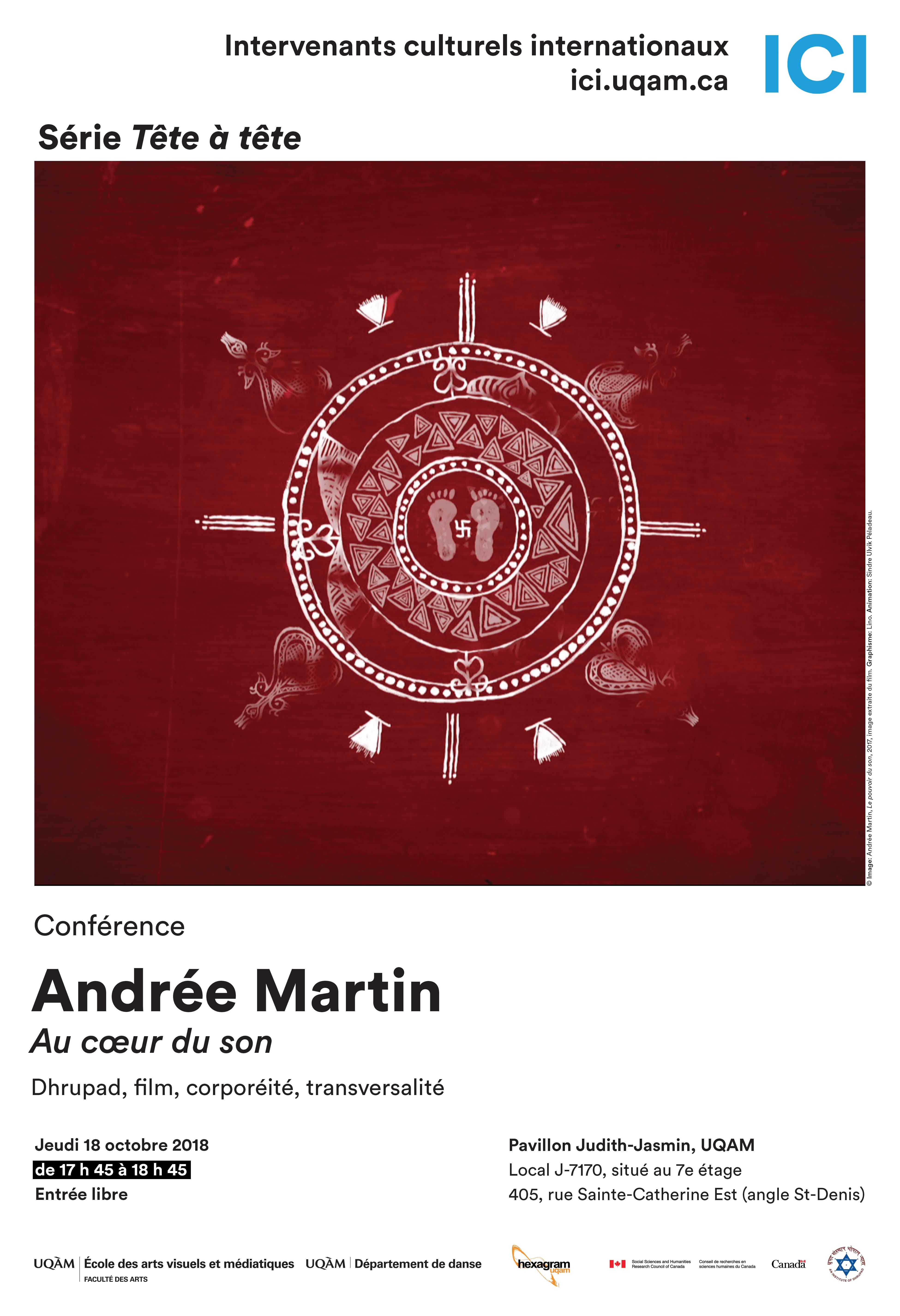 Par cette conférence, Andrée Martin nous invite à refaire le voyage qui l’a menée à réaliser un film, Le pouvoir du son (2017). La chercheuse et praticienne en danse a cherché à comprendre les fondements du dhrupad, une tradition musicale et philosophique millénaire hindoue, en établissant des liens avec des pratiques contemporaines en arts médiatiques et en danse. Il s’agit d’une expérience, tout autant qu’une vision du corps et de l’être, afin de mieux saisir ce qui anime le dhrupad : force de création, force d’émission et de transformation. Ce voyage, humain et artistique, prend la forme d’une traversée rythmée qui permet de plonger littéralement au plus profond de l’être humain et de sa capacité à créer, à transformer et à être transformé.