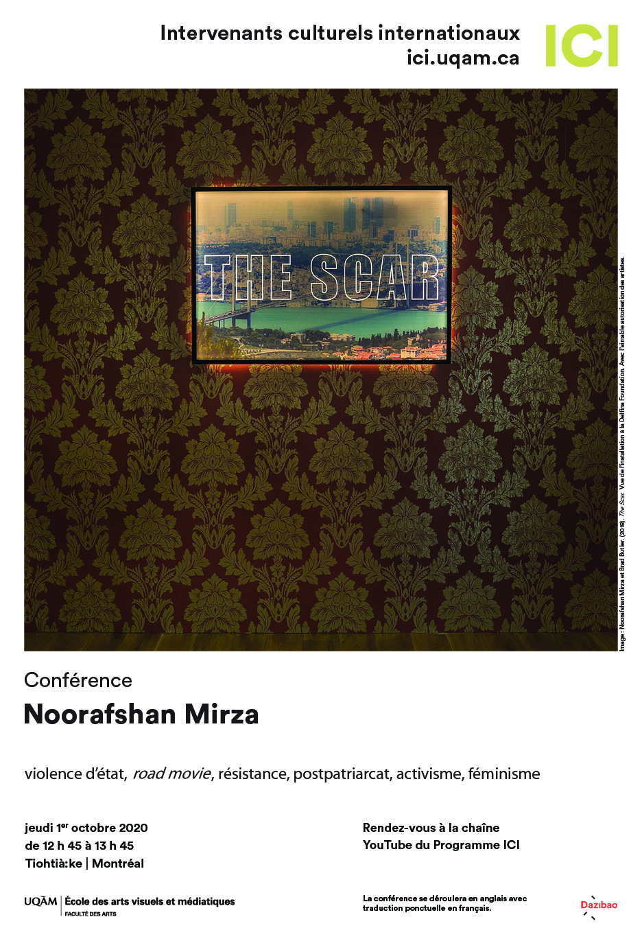 L’équipe du Programme ICI a le plaisir d’accueillir l’artiste Noorafshan Mirza qui présentera une conférence portant sur le road movie féministe The Scar (2018) réalisé en duo avec l’artiste Brad Butler. Elle fera part des sources d’inspiration, des références, des pratiques de travail, des défis rencontrés au cours du projet et des pistes de réflexion qui ont surgi en cours de route. The Scar est présenté en installation jusqu’au 31 octobre à Dazibao.