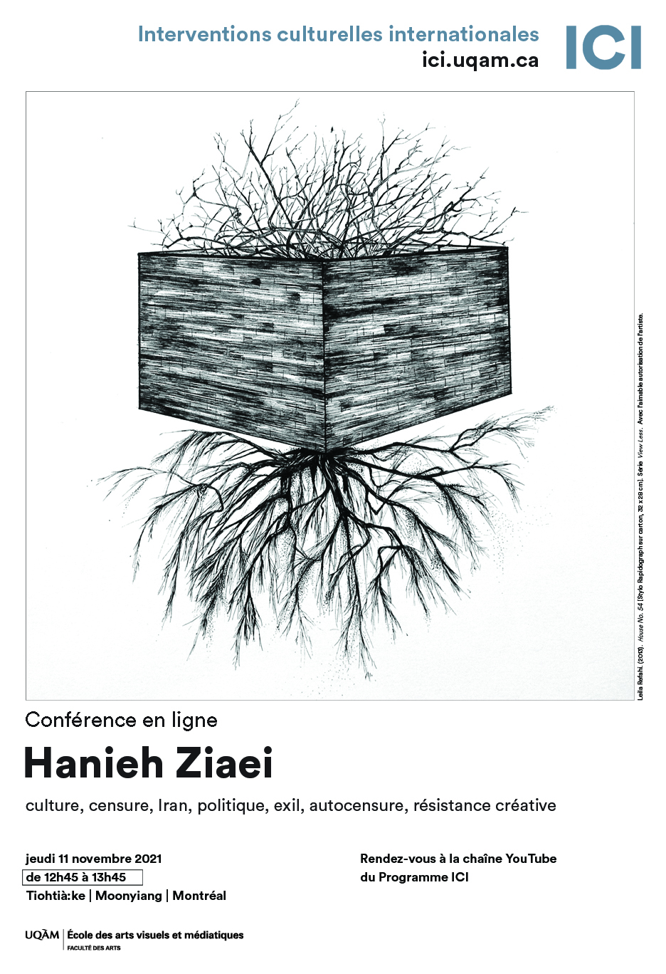 Pour cette deuxième conférence de la saison d’automne 2021, l’équipe du Programme ICI accueille l’iranologue Hanieh Ziaei. Dans le cadre de ses recherches en sociologie, elle étudie le rôle de l’art sous les régimes autoritaires et totalitaires, notamment les dimensions politiques et sociales de l’art contemporain. Hanieh Ziaei discutera de la richesse de la scène artistique et culturelle en Iran, malgré la censure étatique. La conférencière examinera l’espace aléatoire d’une censure négociée, offrant une opportunité de développer l’esprit créatif par la ruse et le détournement. De même, elle évoquera l’autocensure, omniprésente et intériorisée pour une partie des artistes iraniens.